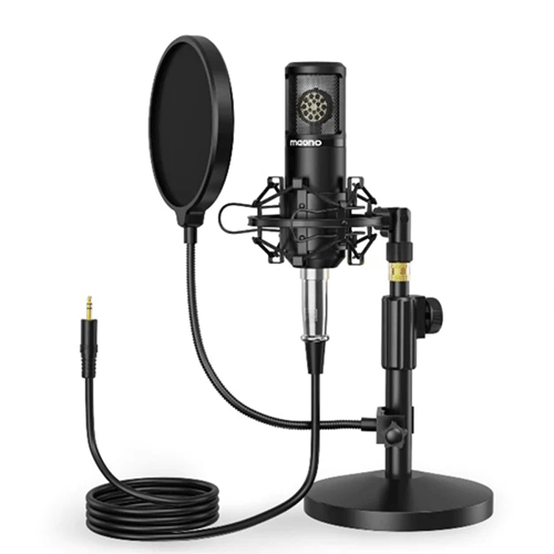 - Includes a tripod stand for stable placement during recording, and a pop filter that minimizes plosives and other unwanted sounds